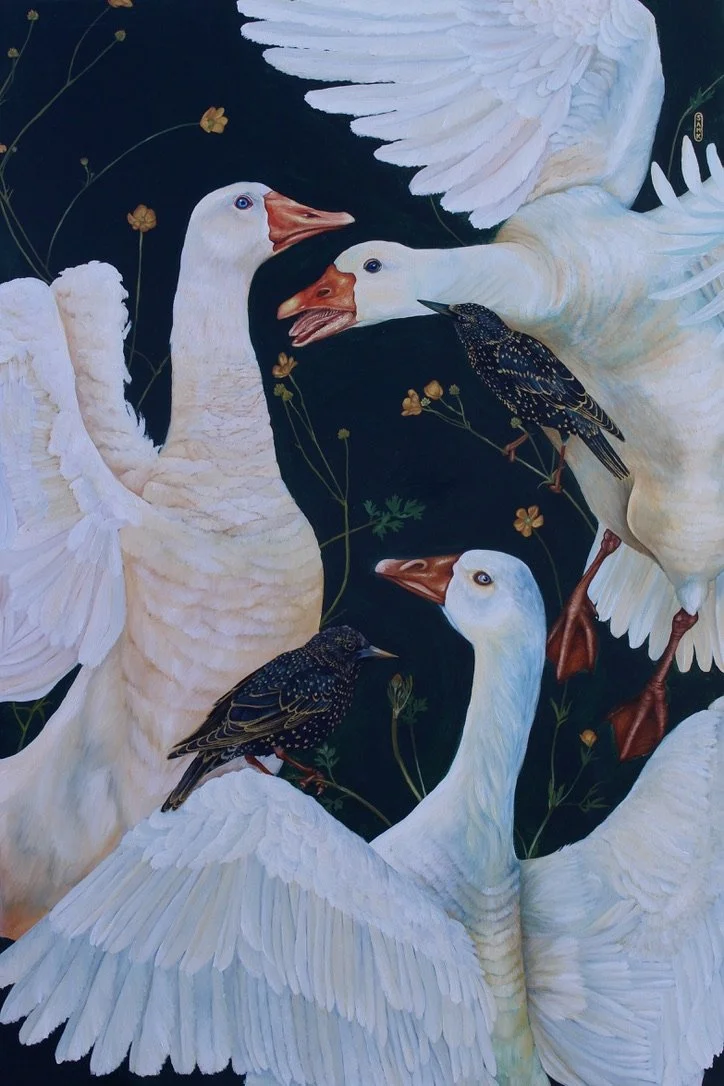 Slide 1 Slide 1 (current slide) geese, starlings, buttercups oil and gold acrylic on canvas 24” x 36”2022